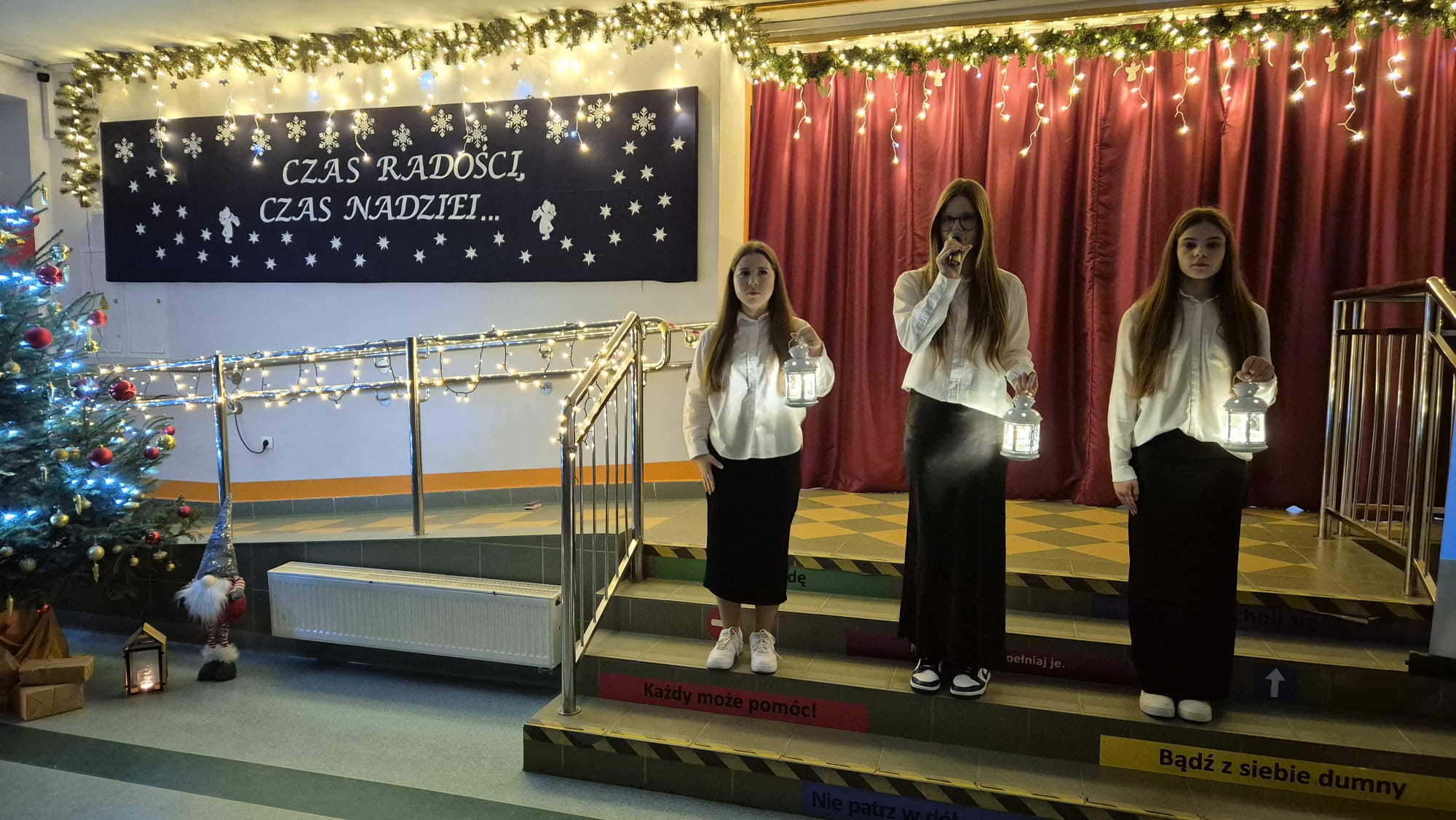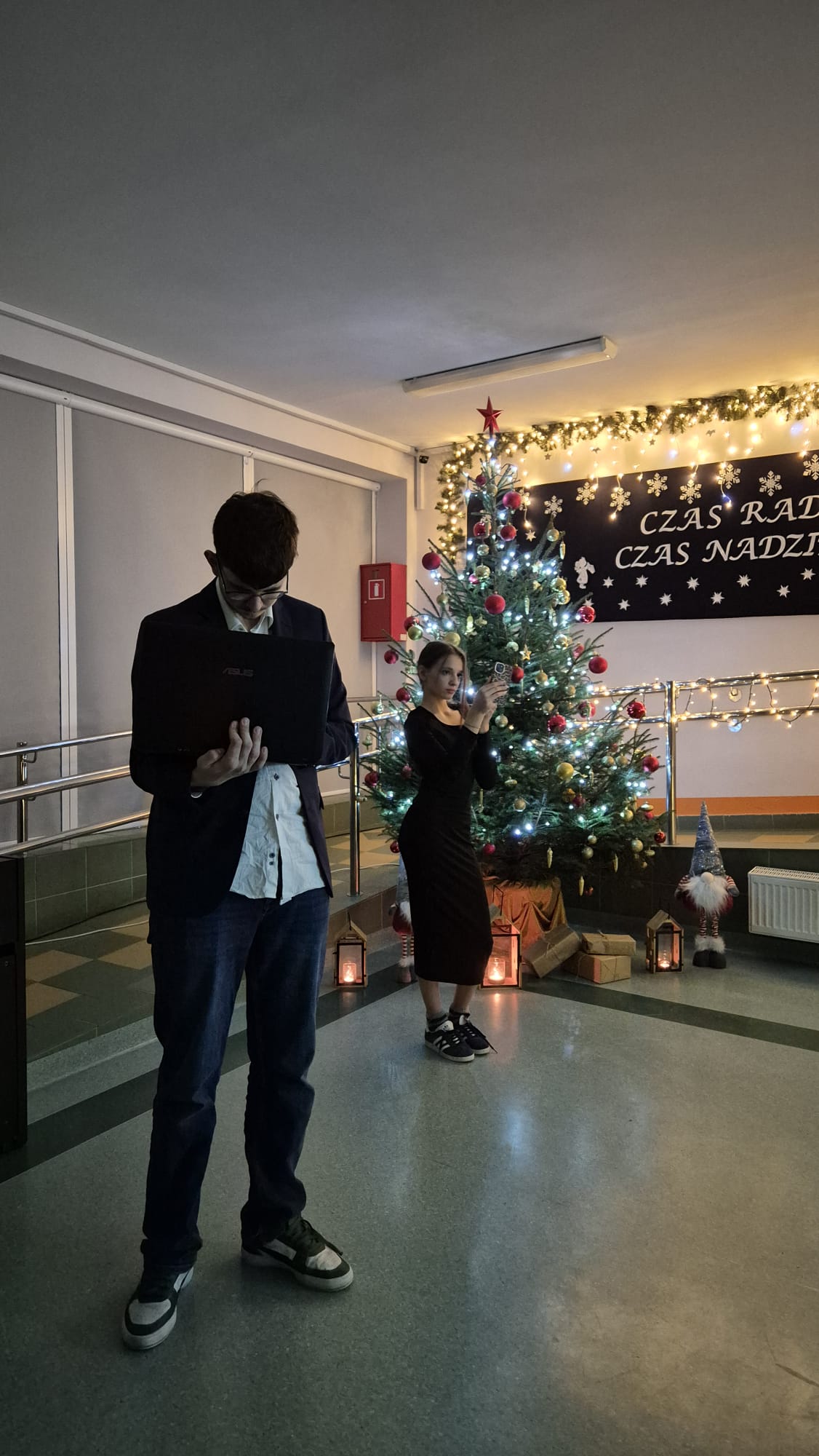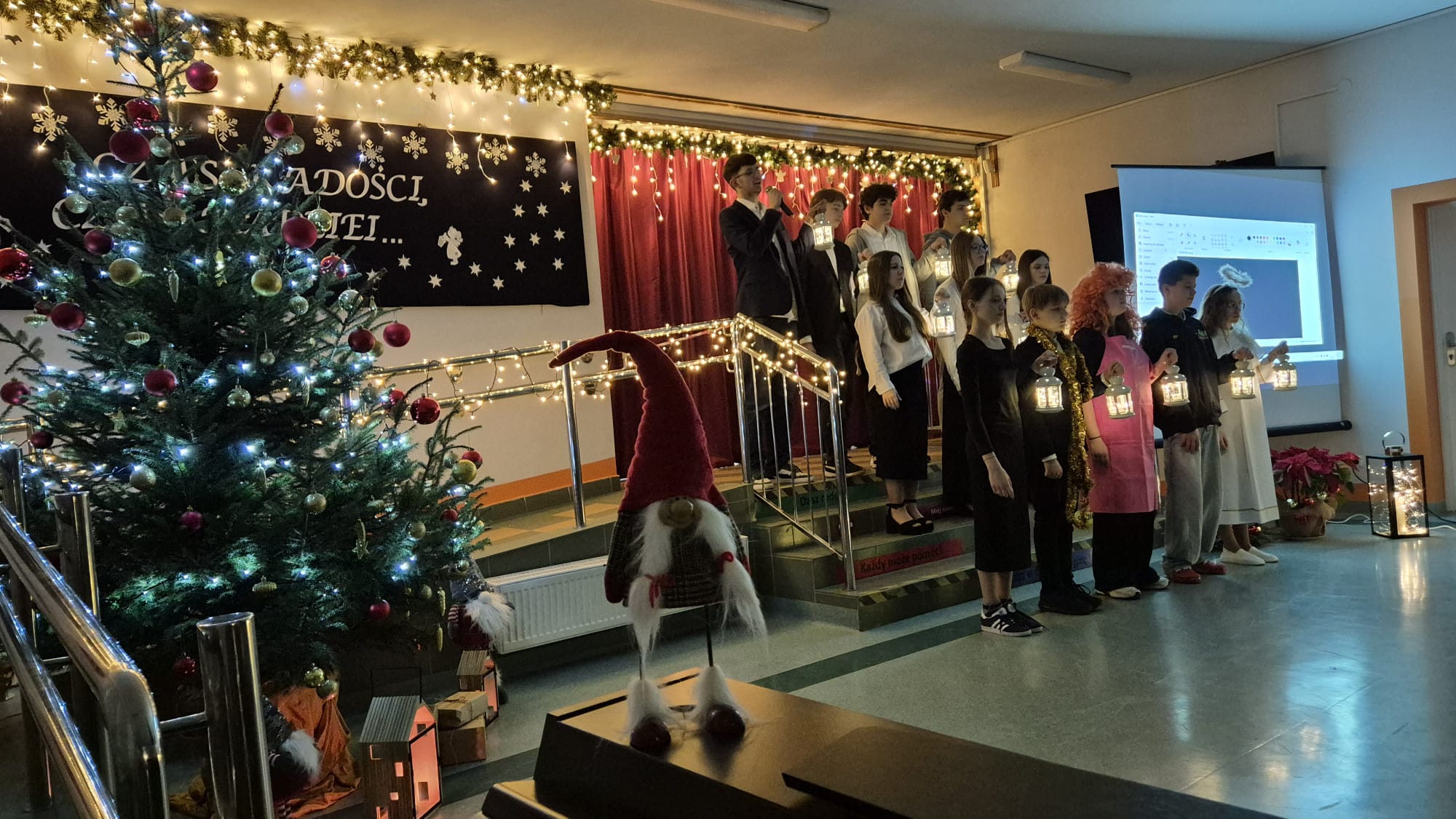 17 grudnia 2025 roku w naszej szkole zaprosiliśmy Dyrekcję, Nauczycieli, Pracowników obsługi oraz wszystkich uczniów na program słowno-muzyczny, aby z radością wczuć się w magiczną atmosferę zbliżających się Świąt.