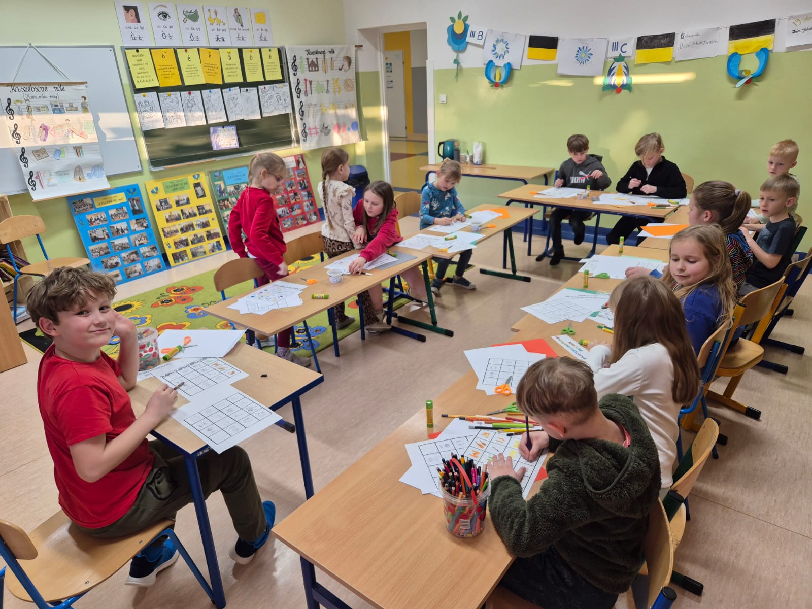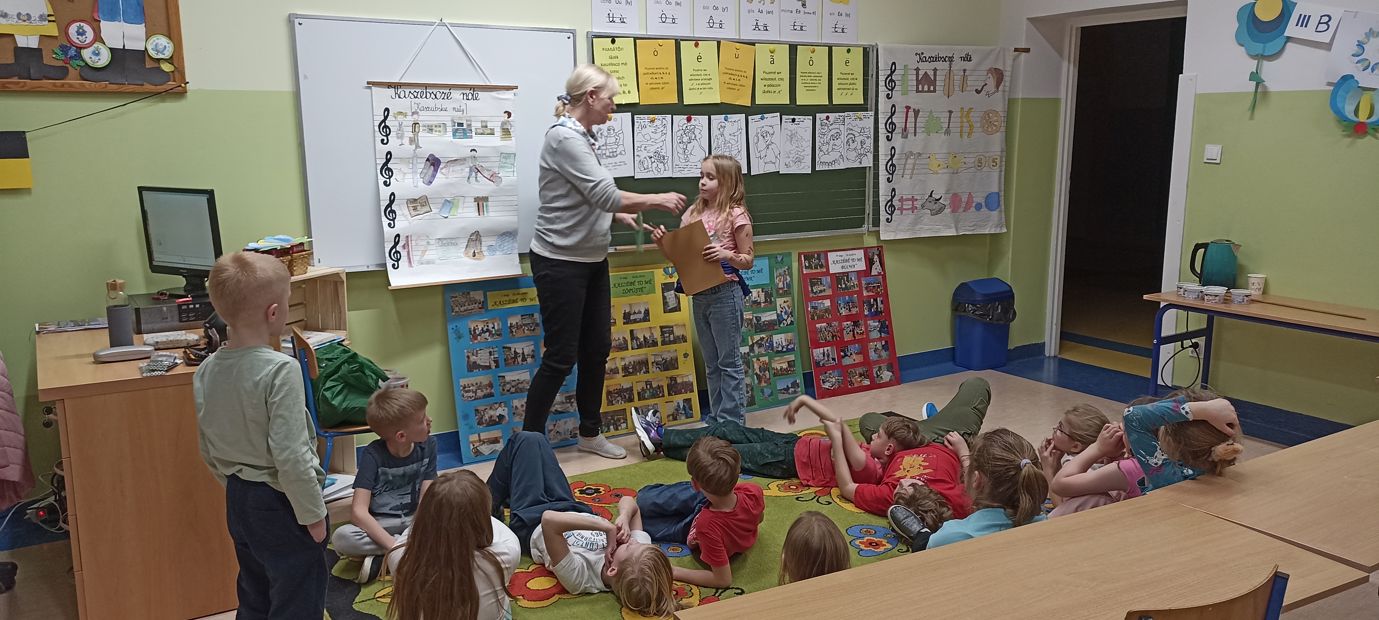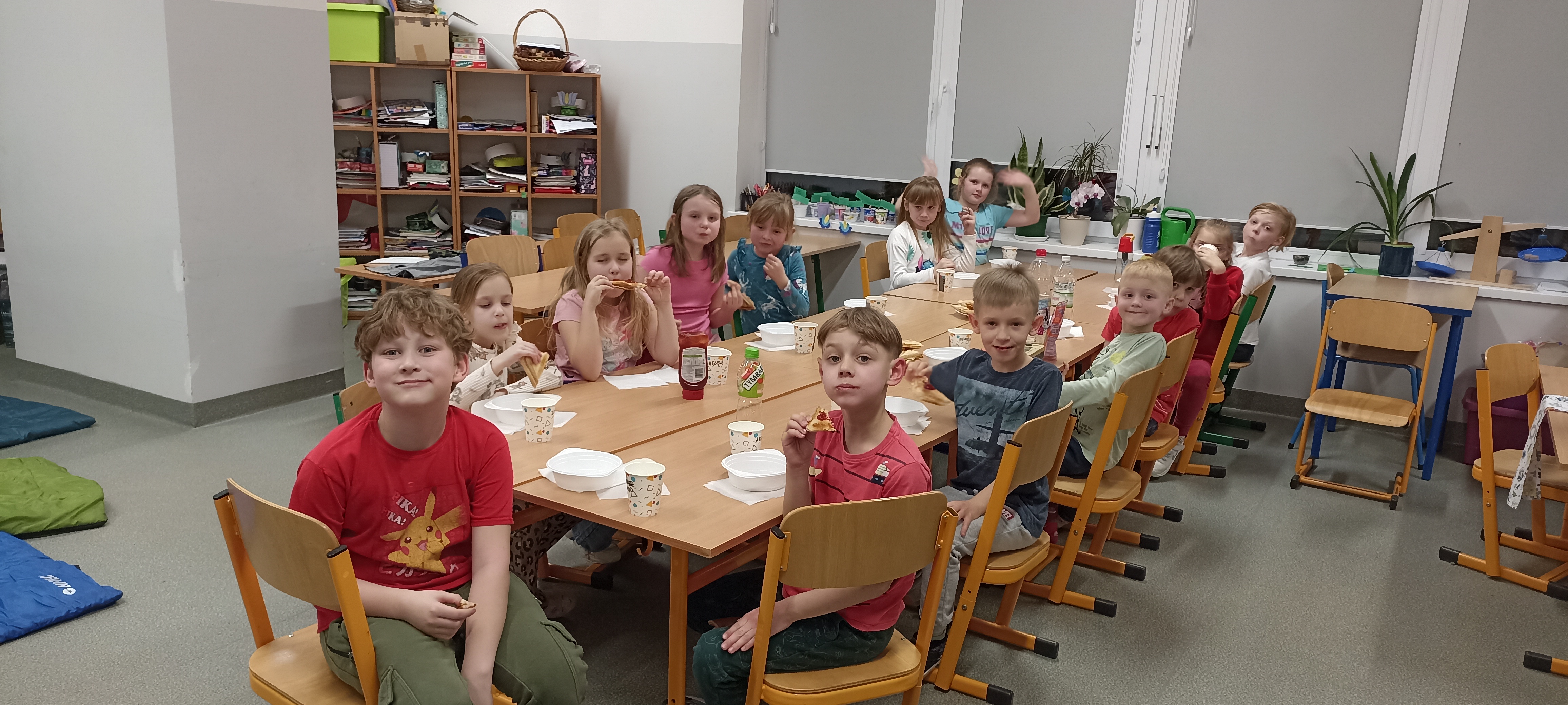 Kolejne nocowanie w naszej szkole przez uczniów uczących się języka kaszubskiego odbyło się dnia 21 na 22.03.2025 r., które przyniosło wiele radości. Tym razem z poduszkami i śpiworami przyszły klasy I c i I d. Wieczór rozpoczął się kolorowaniem i układaniem tradycyjnych kaszubskich nut i nauką robienia na drutach. Potem układanie historyjki po wysłuchaniu legendy kaszubskiej, a na samym końcu uczniowie oglądali bajki wyświetlone przez stary projektor na kliszę. Uczniowie byli zafascynowani atrakcjami tego wieczoru. Sen zmorzył wszystkich o 22.00. Po przebudzeniu porządkowaliśmy salę i zjedliśmy smaczne śniadanie. Ten wieczór na długo pozostanie w pamięci uczniów.