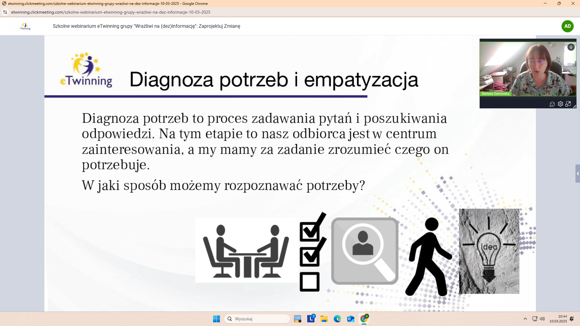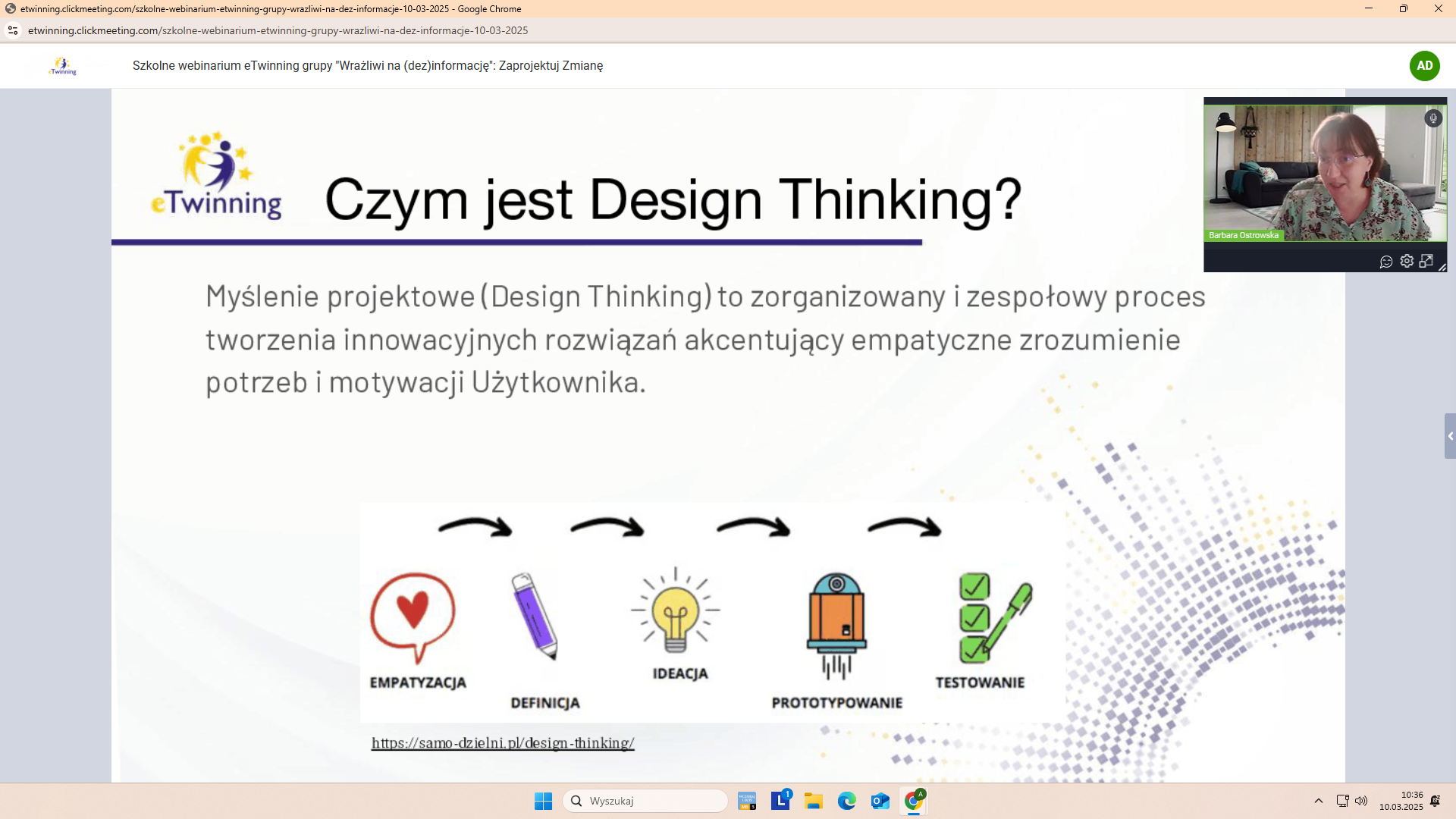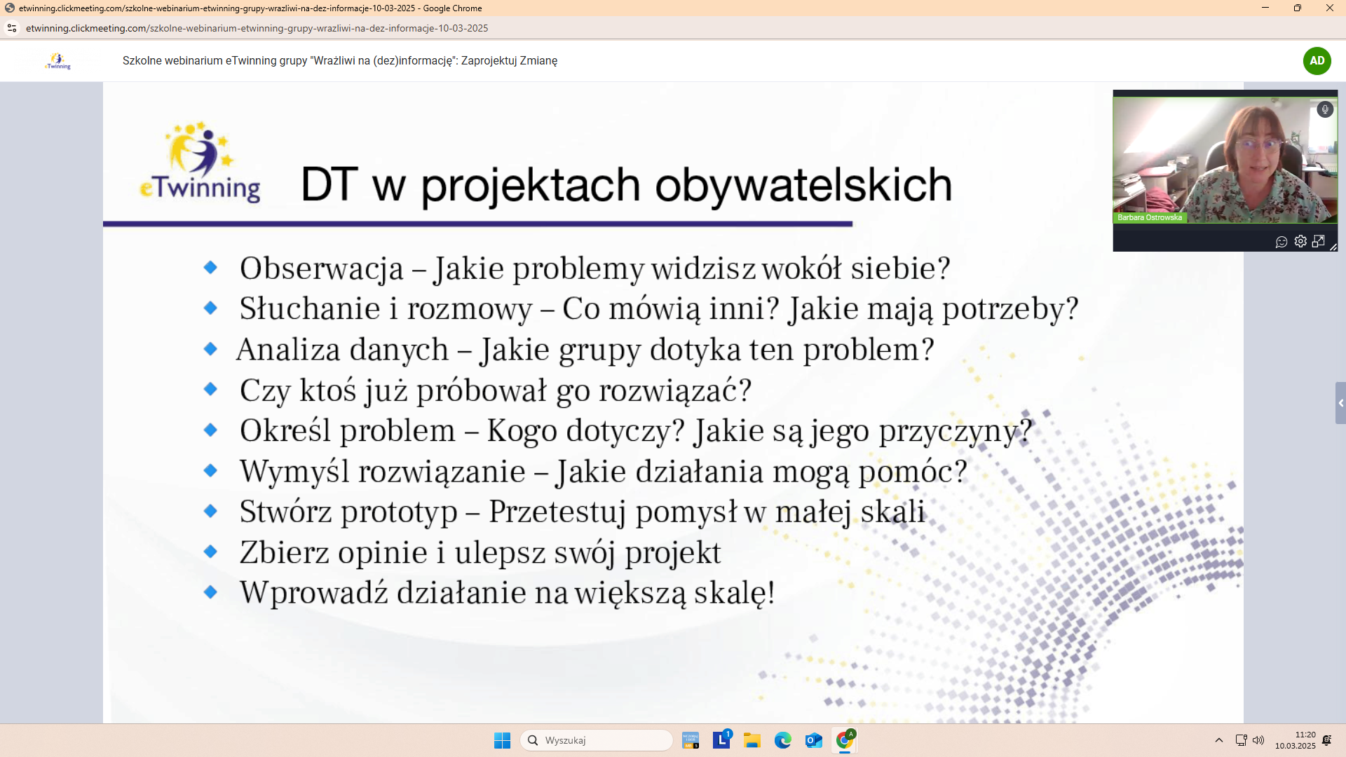 10 marca 2025 r. uczniowie klasy 5b wzięli udział w inspirujących warsztatach organizowanych przez grupę "Wrażliwi na (dez)informację – edukacja obywatelska z eTwinning". Tematem spotkania była metoda Design Thinking – kreatywny sposób rozwiązywania problemów społecznych poprzez empatię, pomysłowość i testowanie idei.