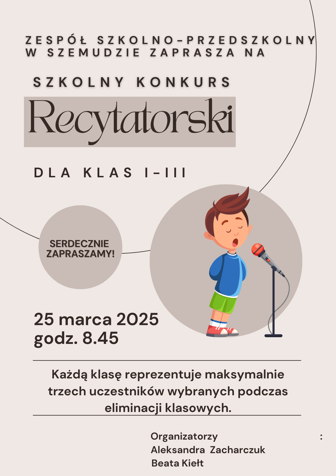 Serdecznie zapraszamy do udziału w szkolnym Konkursie Recytatorskim, który odbędzie się 25 marca 2025 roku o godz. 8.45.