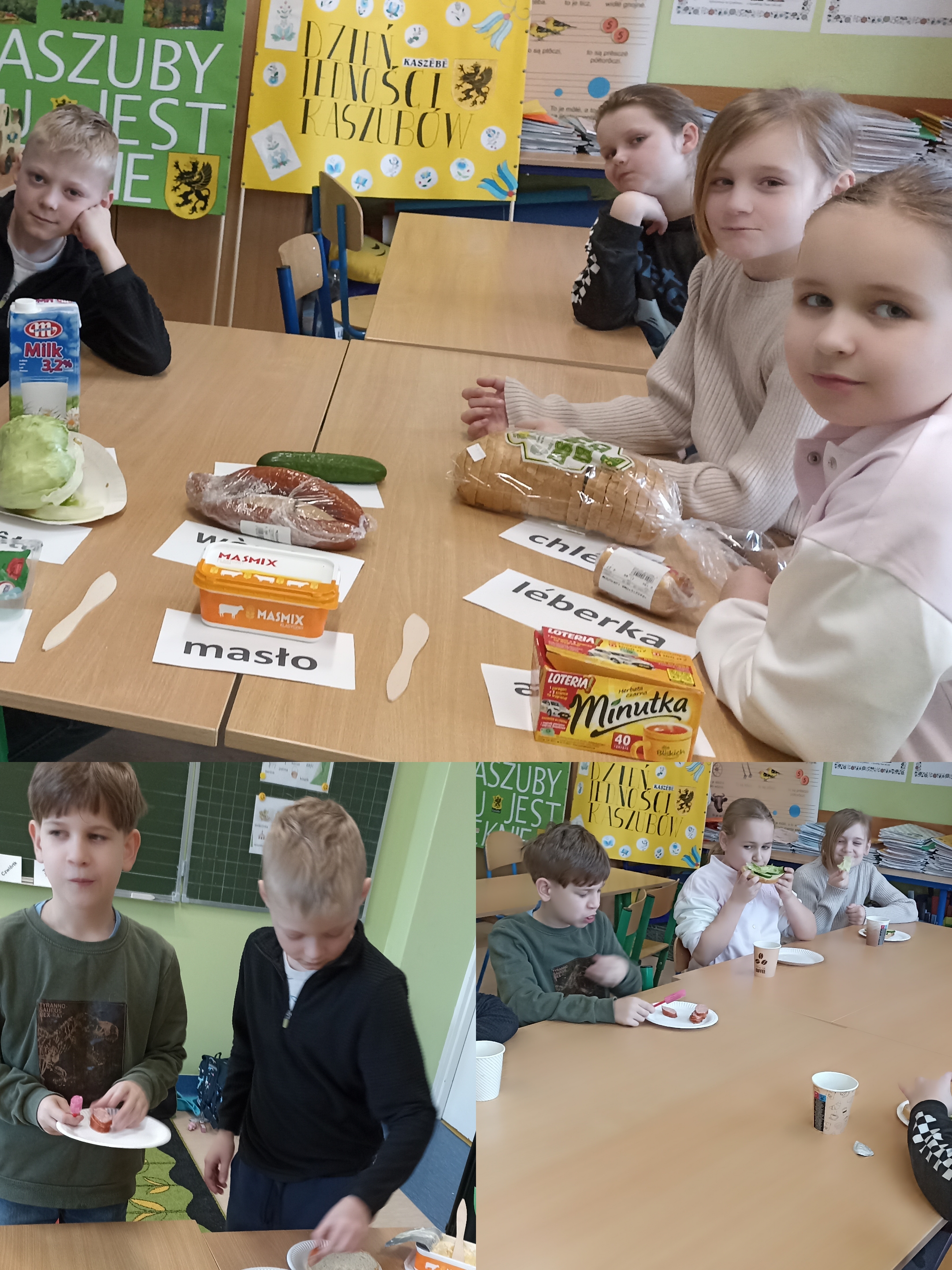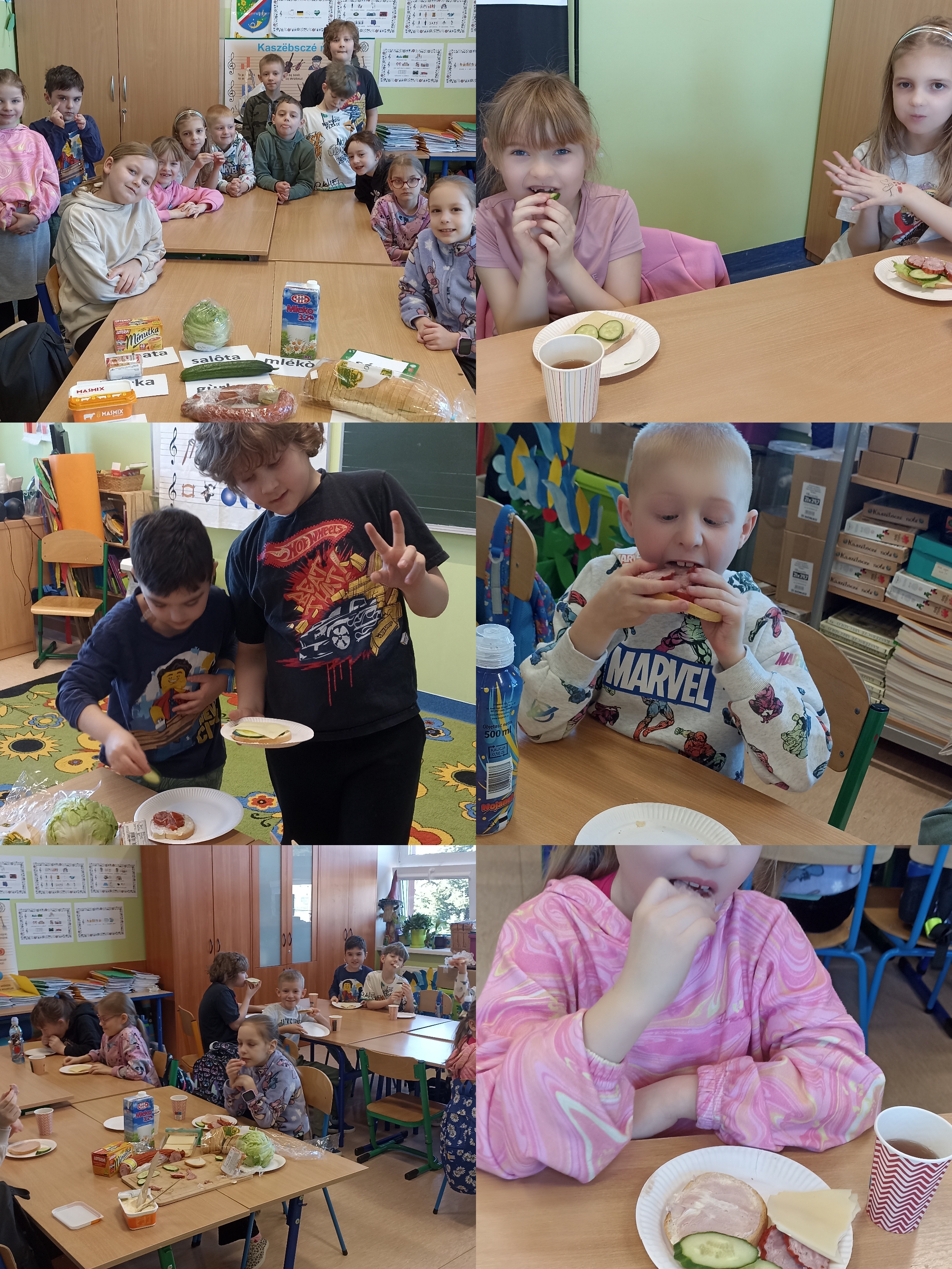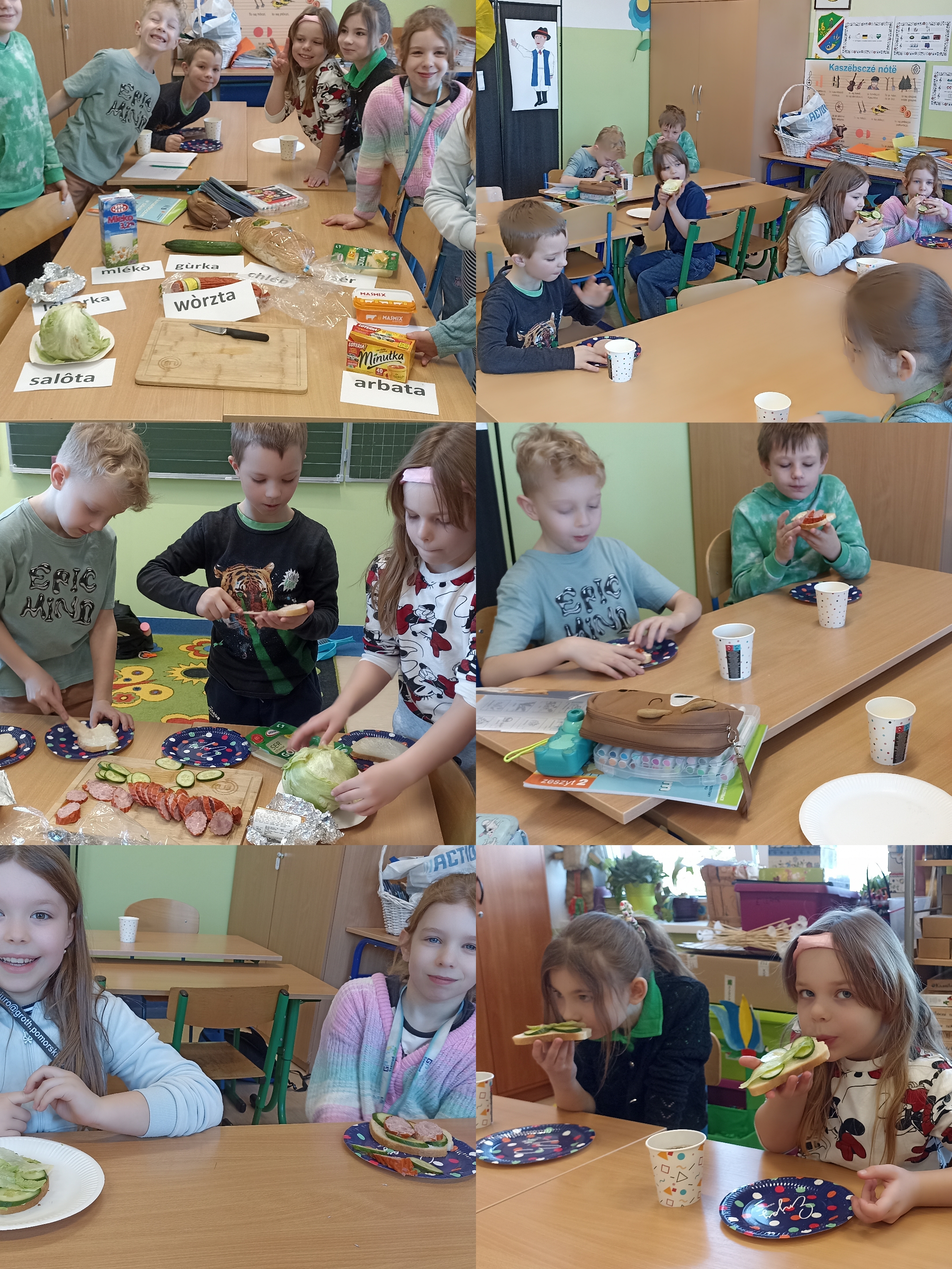 Uczniowie klasy 2 uczący się języka kaszubskiego wzięli udział w zajęciach kulinarnych. Podczas lekcji dzieci samodzielnie przygotowywały kanapki z różnych składników. Z dużym zaangażowaniem wybierali składniki, smarowali pieczywo i układali dodatki, jednocześnie powtarzając nowe słowa. Zajęcia były okazją do nauki poprzez zabawę oraz rozwijania samodzielności i współpracy w grupie. Na zakończenie wszyscy z apetytem zjedli przygotowane przez siebie kanapki. Lekcja sprawiła uczniom wiele radości i była ciekawym sposobem na poznawanie języka kaszubskiego.